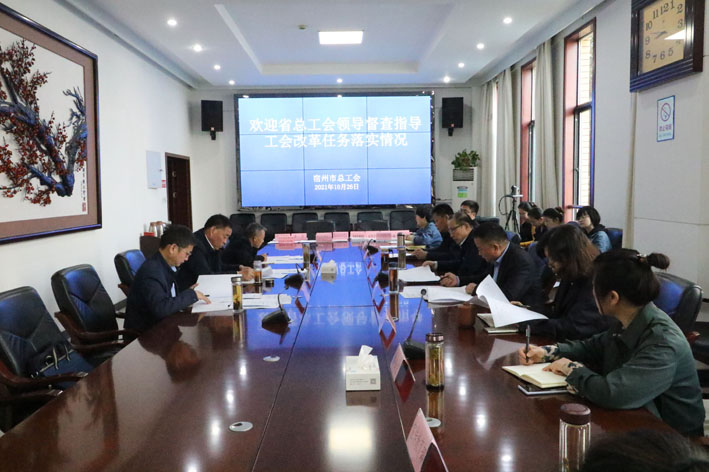 10月26日,安徽省总工会党组成员、副主席阮怀楼、省总工会办公室主任陈金红、省总基层工作部副部长吴家俊等一行来宿开展工会改革任务落实情况督查,重点就推进产业工人队伍建设改革 工作、新就业形态劳动者建会入会工作和劳动领域维护政治安全工作落实情况开展了督查指导。市总工会领导班子成员、各相关部室负责人参加会议。