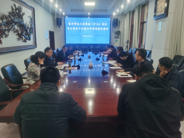 11月15日下午,宿州市总工会召开党组扩大会议,传达学习党的第十九届六中全会精神。市总党组书记、副主席高纯宇主持并讲话。