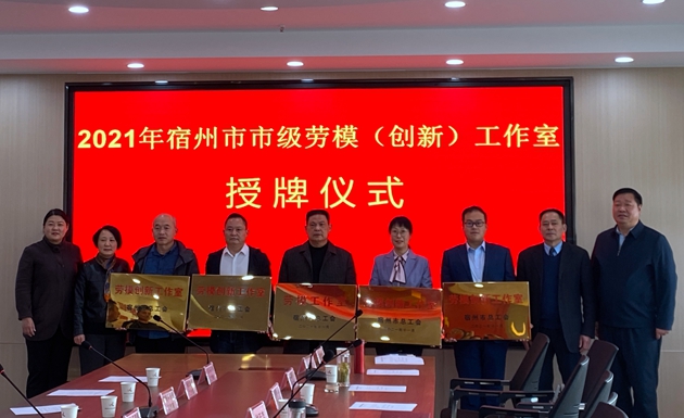 11月20日上午,2021年宿州市劳模(创新)工作室授牌仪式在曹荣劳模工作室召开,市、县(区)总工会经济部分管领导和负责同志、授牌的劳模(创新)工作室负责人到场参加。