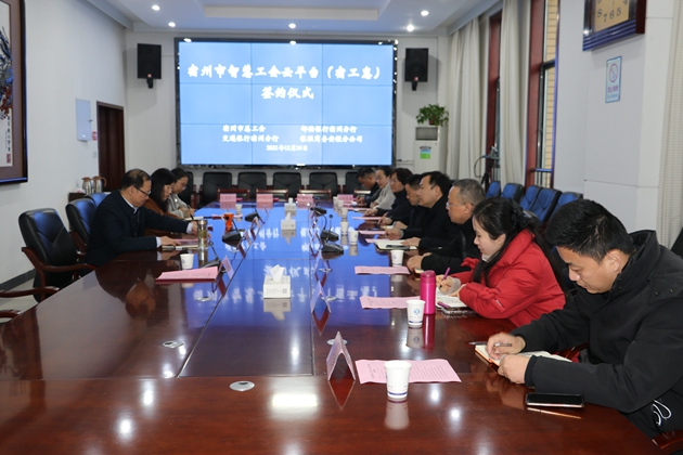 2021年12月24日下午,宿州市总工会、邮储银行宿州分行、交通银行宿州分行、银联商务安徽分公司四家单位在市总工会二楼会议室举行宿州市智慧云工会平台(宿工惠)建设项目签约仪式。