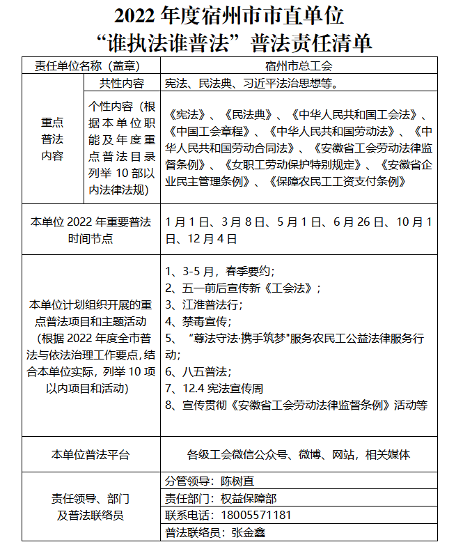 2022年度宿州市市直单位“谁执法谁普法”普法责任清单