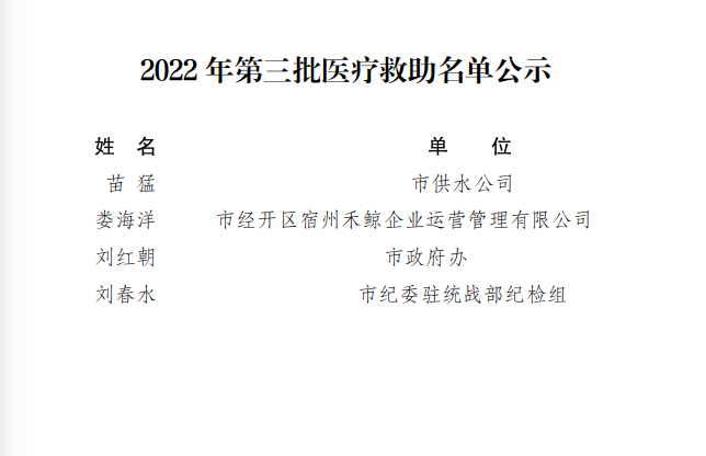 经9月28日市总党组会议研究决定,现对市直单位基层工会上报4名医疗救助人员拟予以公示(附公示名单)。公示时间为5个工作日。任何单位和个人如对资助对象有异议,请在公示期间以书面形式或以电话方式向宿州市总工会反映。以单位名义反映情况的材料须加盖单位公章,以个人名义反映情况的材料须署名。