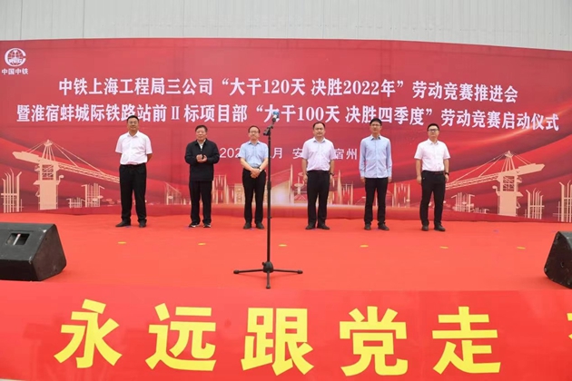 9月28日上午,中铁上海局三公司“大干120天 决胜2022年”劳动竞赛推进会暨淮宿蚌城际铁路站前II标项目部“大干100天 决胜四季度”劳动竞赛启动仪式在宿州召开。市总工会党组书记、副主席高纯宇,安徽省省部属(直管)企事业工会主席马林,市发改委二级调研员赵志柱等出席活动。