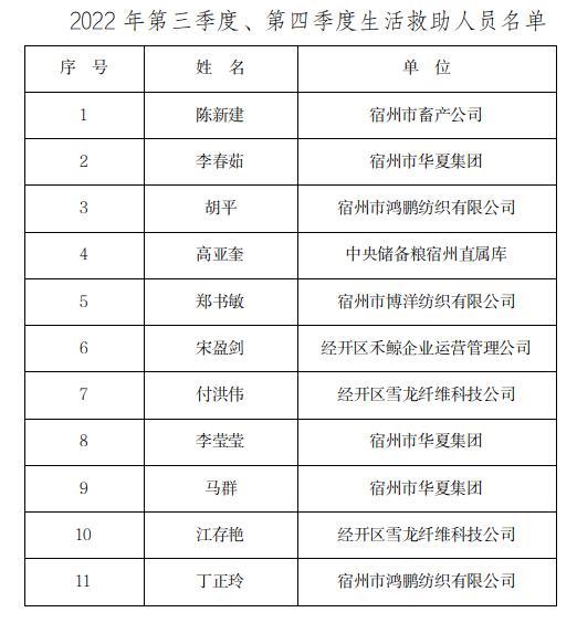 经12月16日市总党组会议研究决定,现对予以进行2022年第三季度、第四季度生活救助的人员进行公示(附公示名单)。公示时间为5个工作日(12月19日-12月23日)。任何单位和个人如对资助对象有异议,请在公示期间以书面形式或以电话方式向宿州市总工会反映。以单位名义反映情况的材料须加盖单位公章,以个人名义反映情况的材料须署名。