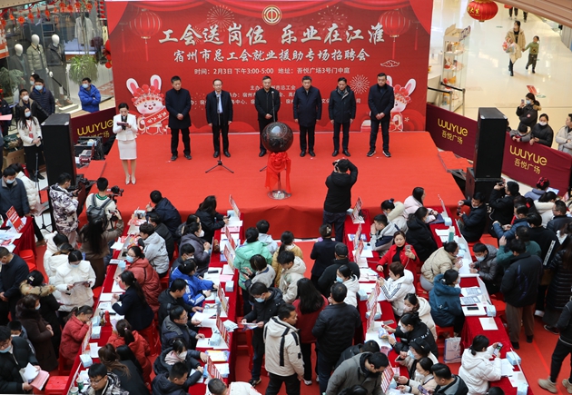 2月3日下午,“工会送岗位乐业在江淮”宿州市总工会2023年就业援助行动专场招聘会在吾悦广场启动。市人大常委会党组成员、副主任、市总工会主席张亮出席并宣布活动启动,省教科文卫体工会主席、一级调研员吴海明来宿观摩,市总工会党组书记、副主席高纯宇致辞。市总工会党组成员、副主席陈树直,市人社局党组成员、副局长周志强,市高新区管委会党工委委员、副主任马雷参加活动。