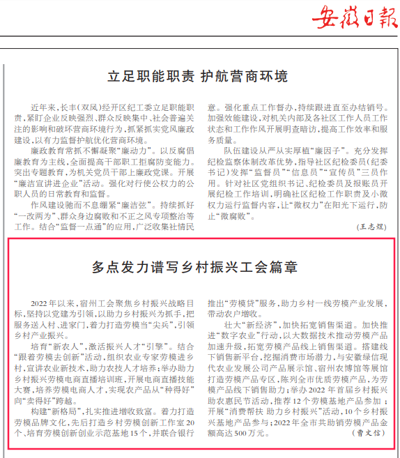 2022年以来,宿州工会聚焦乡村振兴战略目标,坚持以党建为引领,以助力乡村振兴为抓手,把服务送入村、进家门,着力打造劳模当“尖兵”,引领乡村产业振兴。