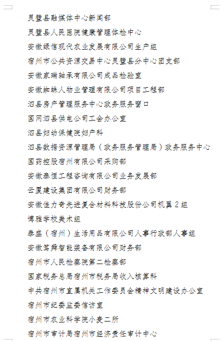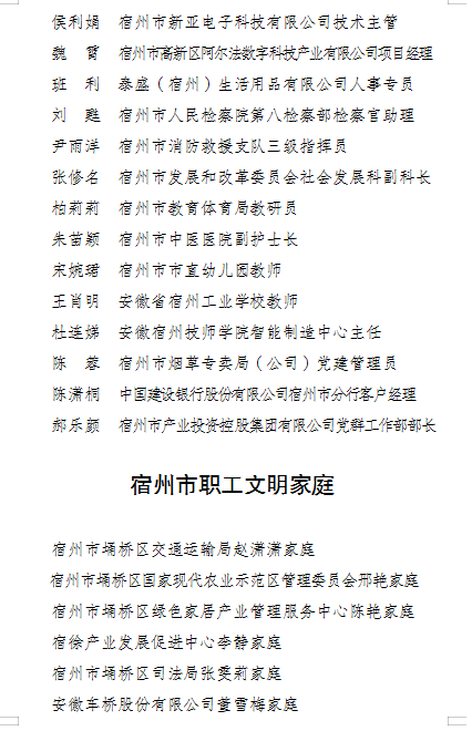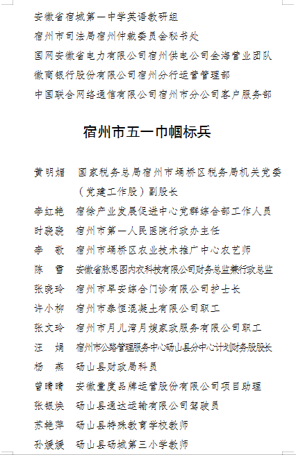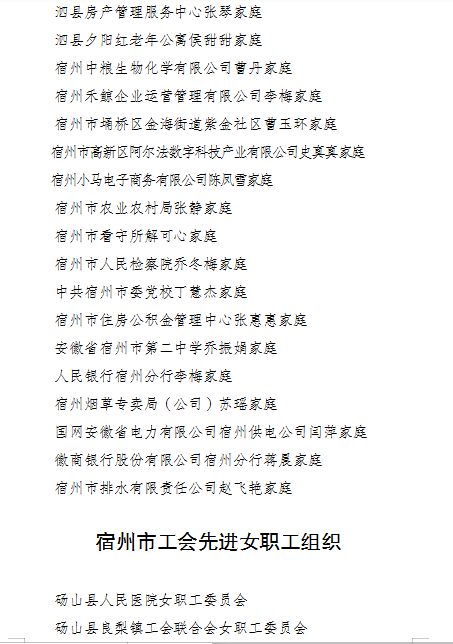 按照宿州市总工会《关于开展2024年度全市先进女职工集体和个人推荐评选活动的通知》文件要求,为体现公开、公平、公正原则,自觉接受公众的监督,广泛听取社会各界的意见,现将相关评选推荐情况予以公示(名单见附件)。任何单位和个人对公示名单如有异议,请于2024年4月28日前以电话、电子邮件或信函等方式反映(信函以到达日邮戳为准)。