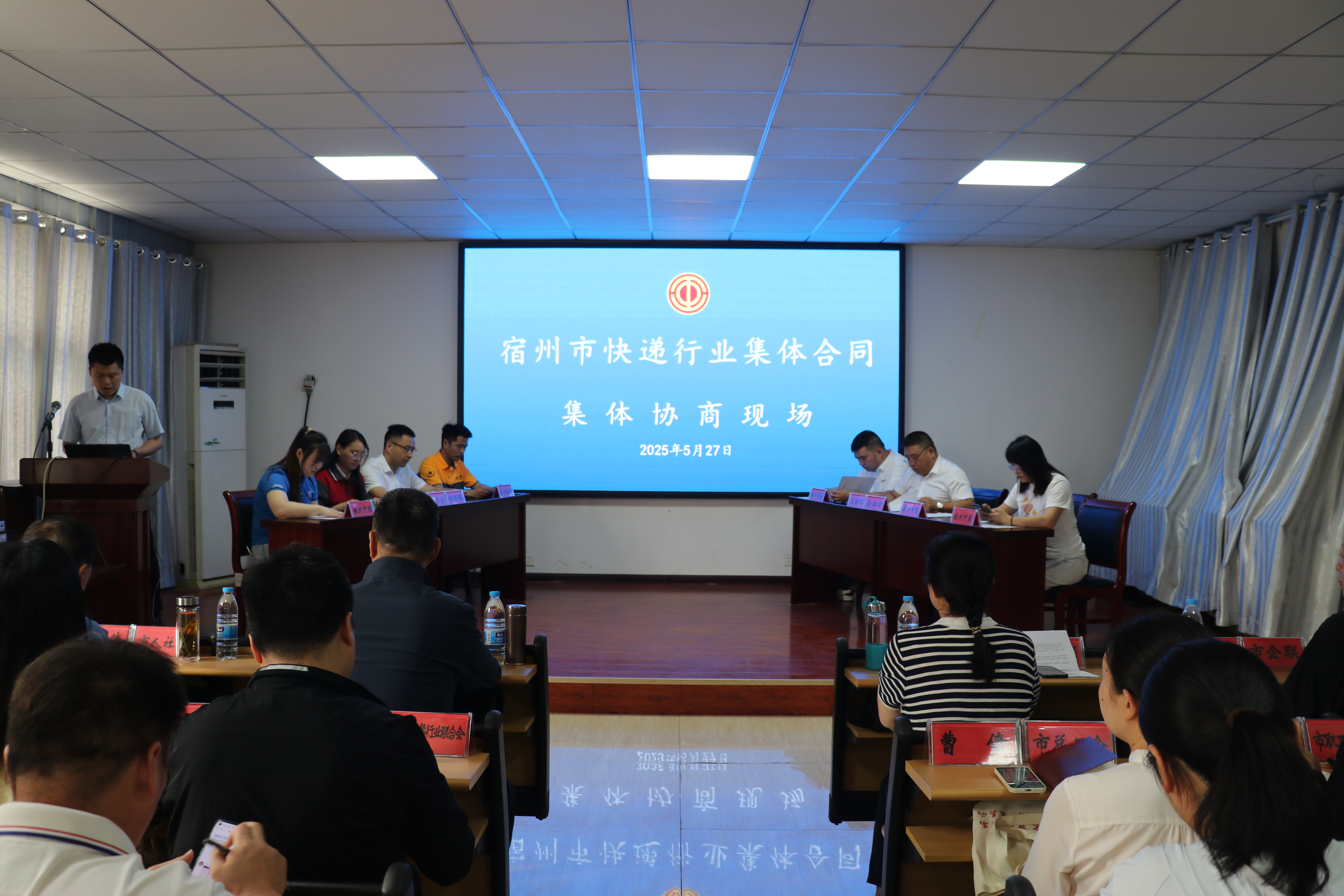 会议听取了快递行业工会联合会2025年度集体协商工作筹备情况汇报,集中观摩宿州市快递行业集体协商和集体合同签订,书面学习了全国总工会、人力资源社会保障部、中国企业联合会、全国工商联联合印发的《新就业形态劳动者权益协商指引》,向宿州市快递行业协会颁发市快递行业劳动争议调解中心牌匾。会上听取了市管各园区2025年集体协商“春季要约”工作进展情况、存在问题、原因分析和下一步工作计划。