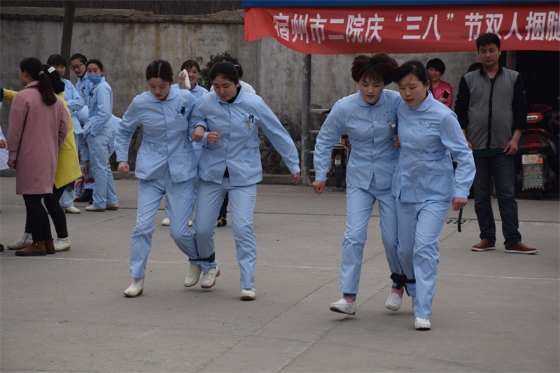 “加油!加油!”一声声响亮而有力的呐喊声在市二院河畔广场此起彼伏,胜利的欢呼声洋溢在春暖花开的三月里,格外引人注目。为庆祝国际“三八”妇女节,丰富二院妇女同志的业余文化生活,3月4日下午,我院工会组织举办了一场别开生面的“双人绑腿跑”比赛活动。